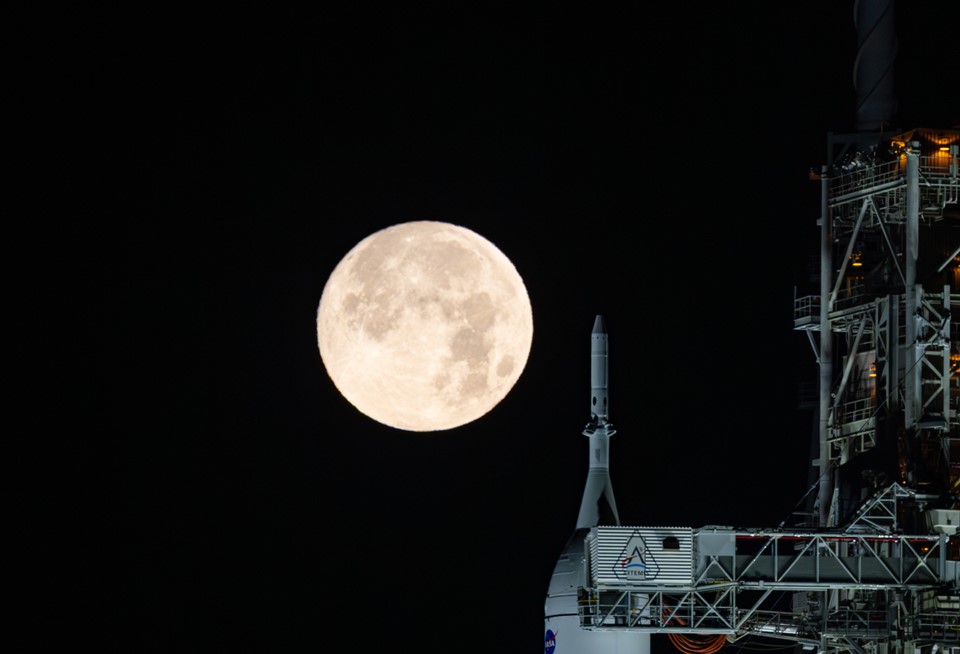 2026年02月01日未明、フロリダ州ケネディ宇宙センターで、モバイル・ランチャー上に設置された SLS(スペース・ローンチ・システム)と Orion(オリオン)宇宙船の上に満月が輝く様子。